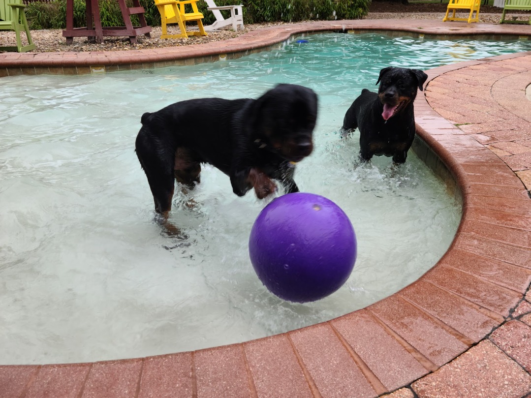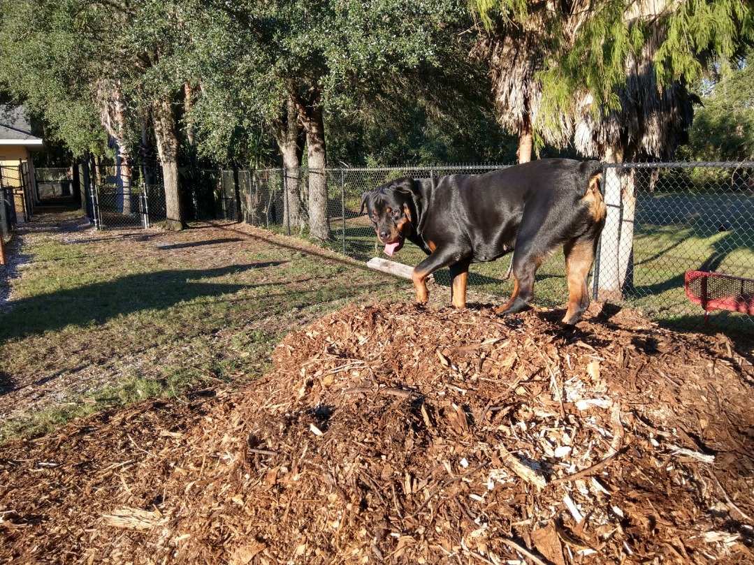 Vaccinations required: Rabies, DHLPP, Bordetella. Off-leash boarding on a large property. Individual and group play available.