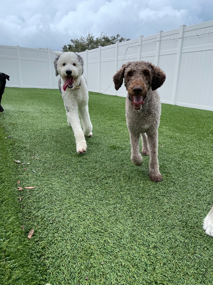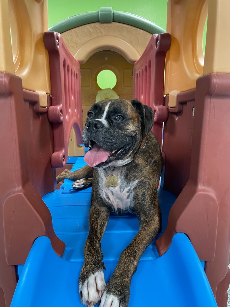 Services include dog daycare and boarding. Boarding dogs are not confined all day; instead, they participate in play activities both inside and outside alongside daycare dogs.